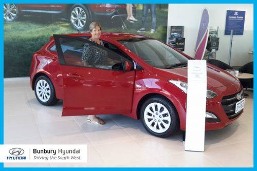 8/09/2016 - Cathy from Capel with her all-new Hyundai i30 Active in Brillant Red from Bunbury Hyundai. Happy driving!