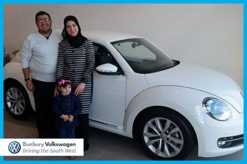 8/09/2016 - Hind and Abdul with their daughter and all-new Volkswagen Beetle from Bunbury Volkswagen. Happy driving!